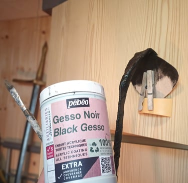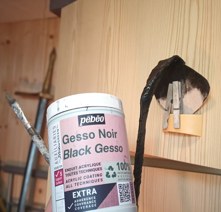 If you're working with only a few hairs, thin whool or fur it's a good idea to paint the tail in a dark base color depending on your fur color. I'm building a black tail, so black gesso is fine. If you hang it somewhere, you can paint almost all at once.