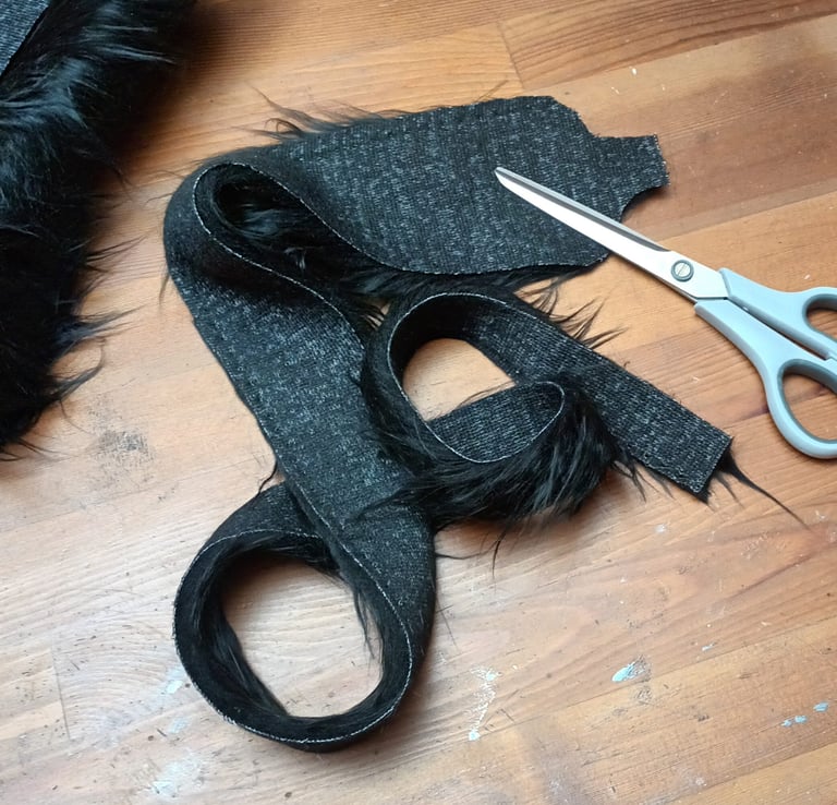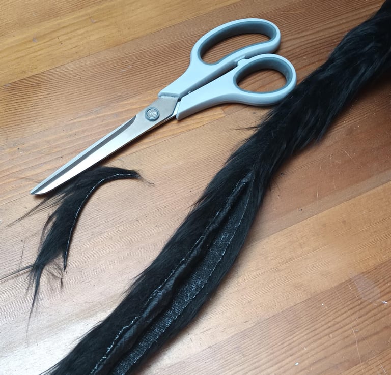 Now work along the other side: Hold on the fur and cut outsticking material. Save small strips if you cut too much and want to add them later.